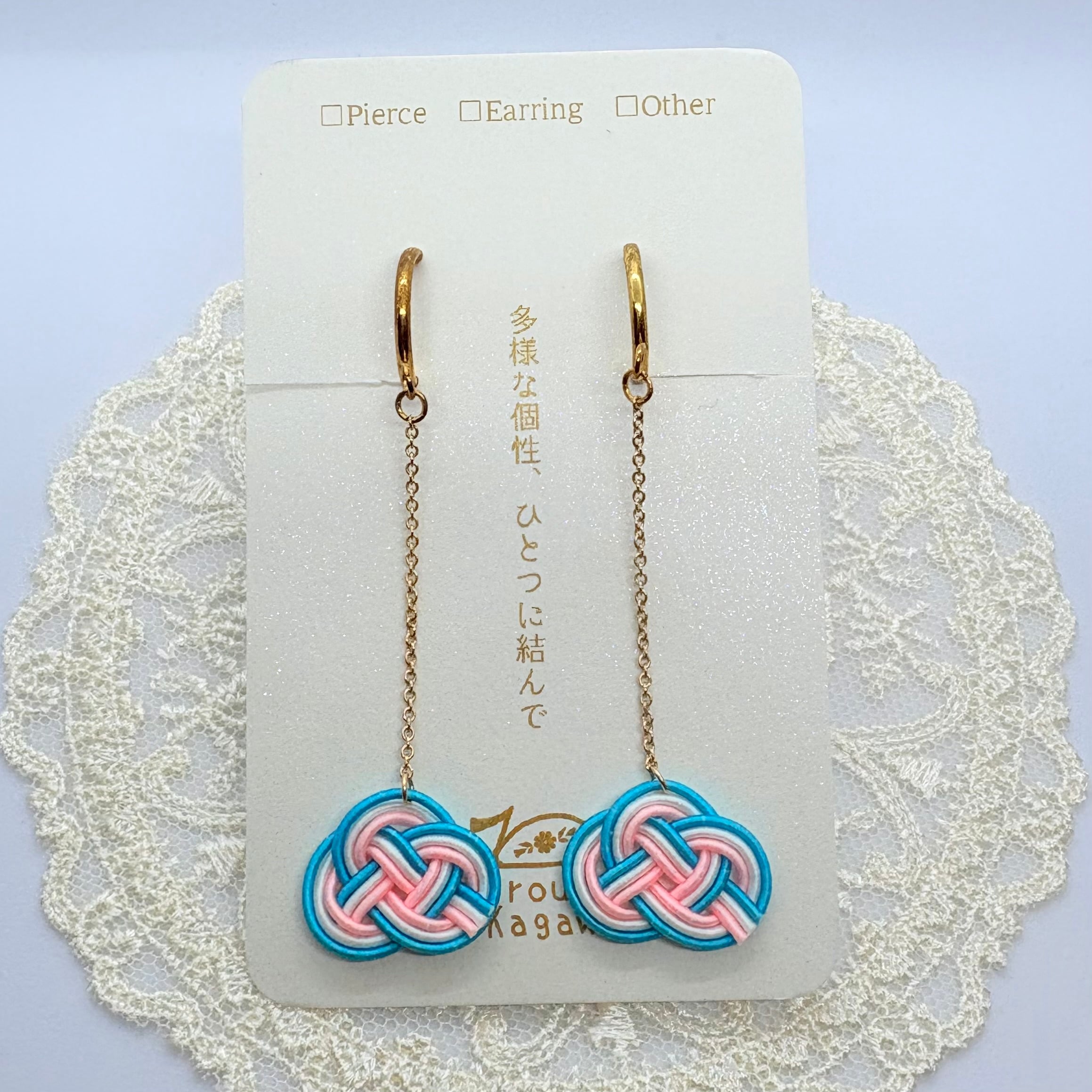 ひとつひとつ丁寧に結んだ水引は、トランスジェンダーフラッグのカラーデザイン。