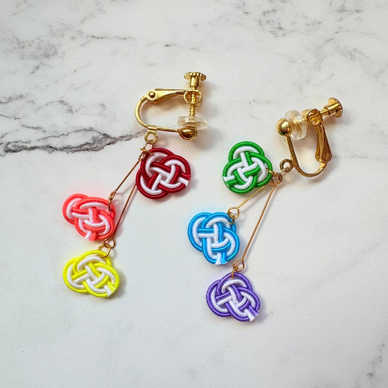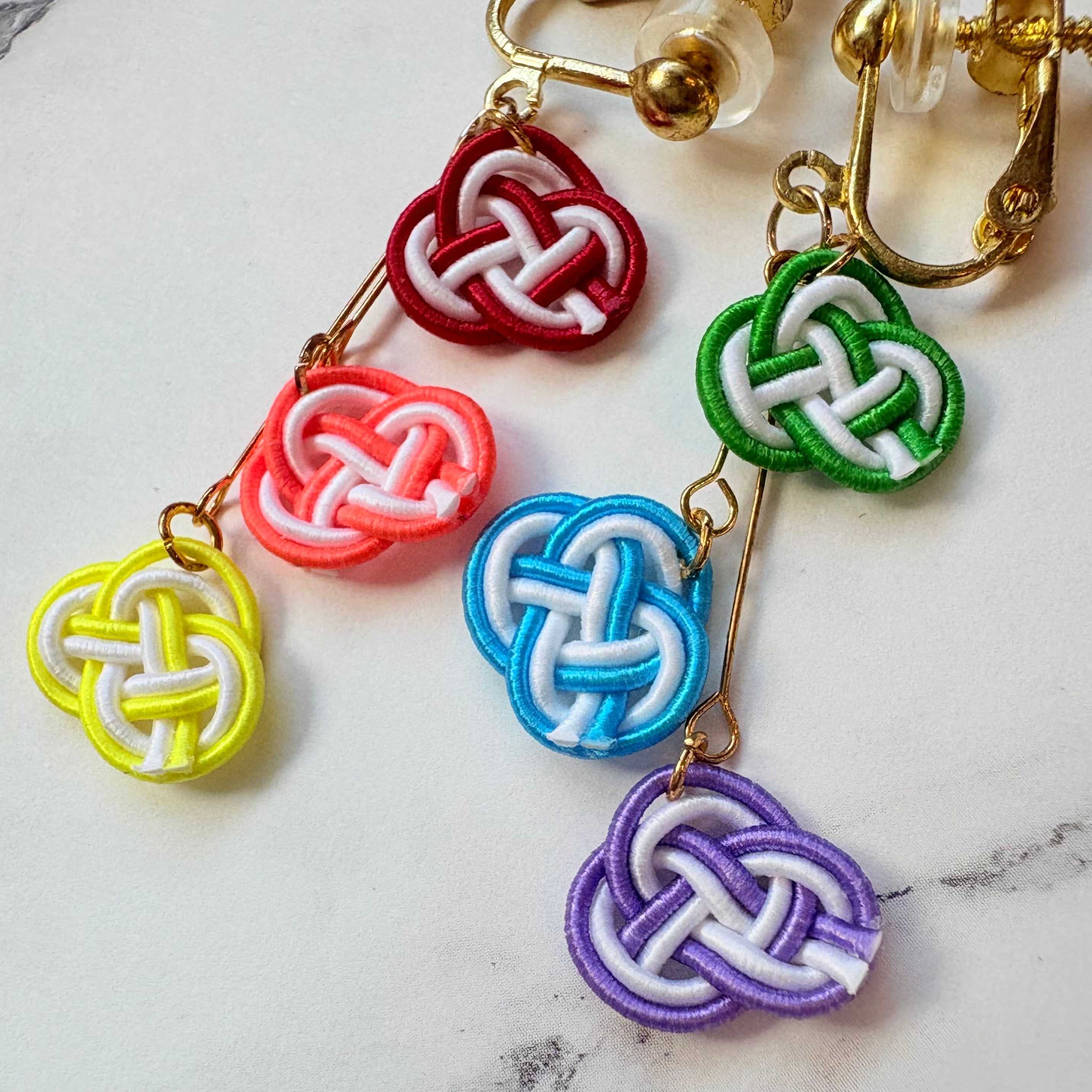 ひとつひとつ丁寧に結んだ水引を繋げて、両耳でつけるとレインボーフラッグのカラーデザインにしました。