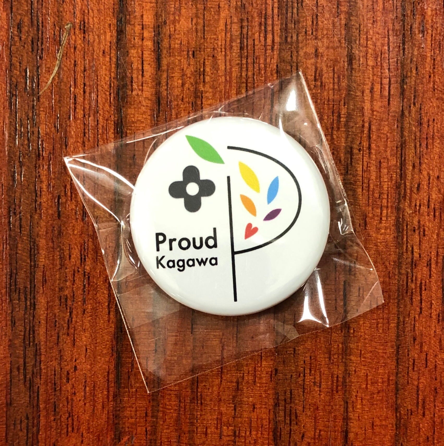 プラウド香川のマークの缶バッジです。ProudのPと香川県の木のオリーブをモチーフにしています。アライの人が付けても素敵です。